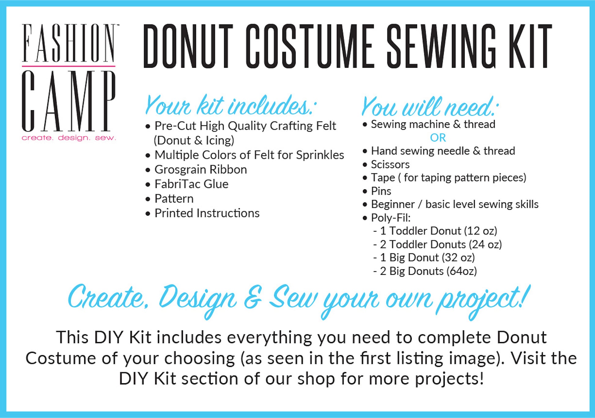 1) DIY - The Kit will arrive in a bag. The donut portion needs to be sewn (instructions included), frosting and sprinkles glued (fabric glue included), sprinkles need to be cut, and donut needs to be stuffed with Polyfil (NOT INCLUDED). Lastly, ribbon straps need to be attached (can be pinned, or sewn).