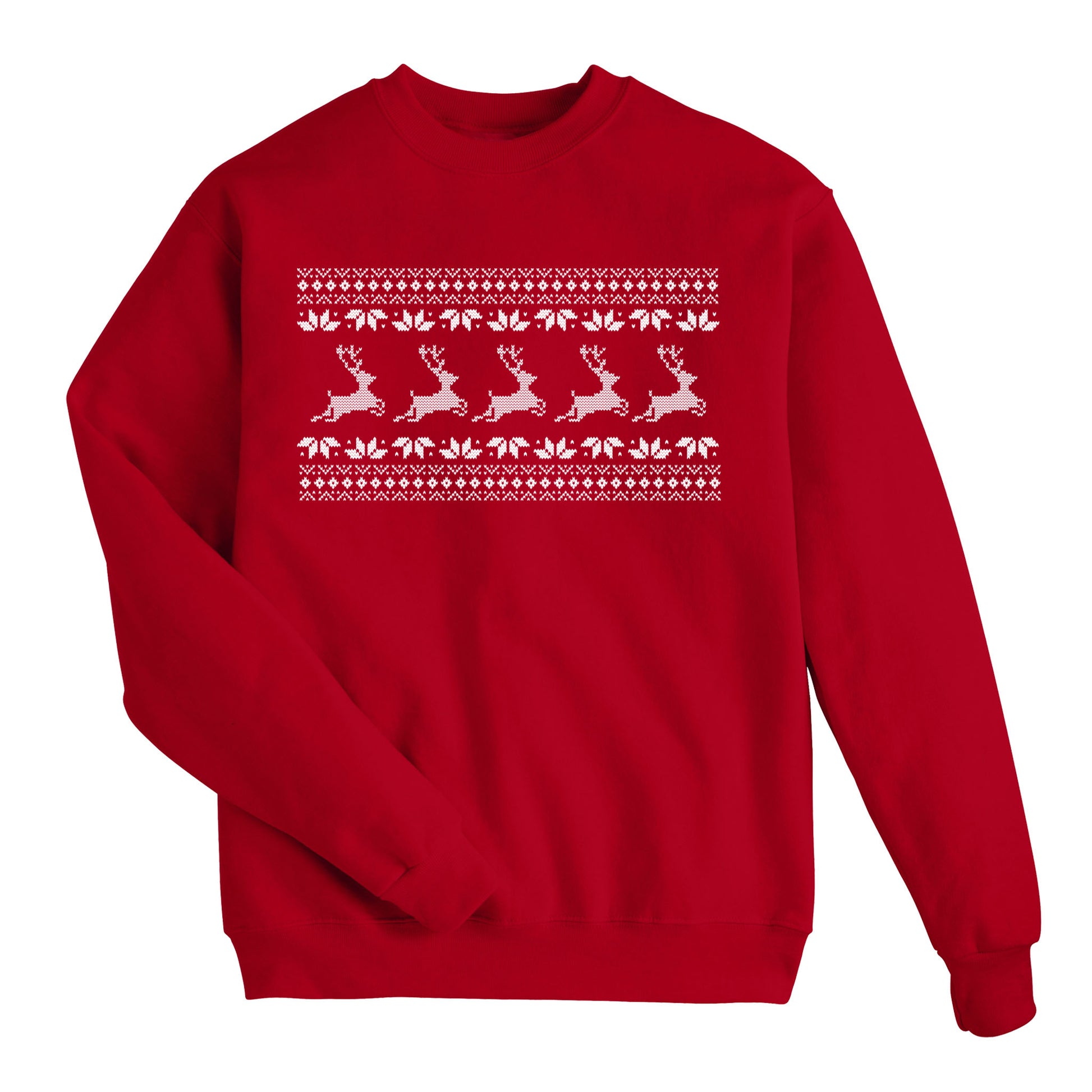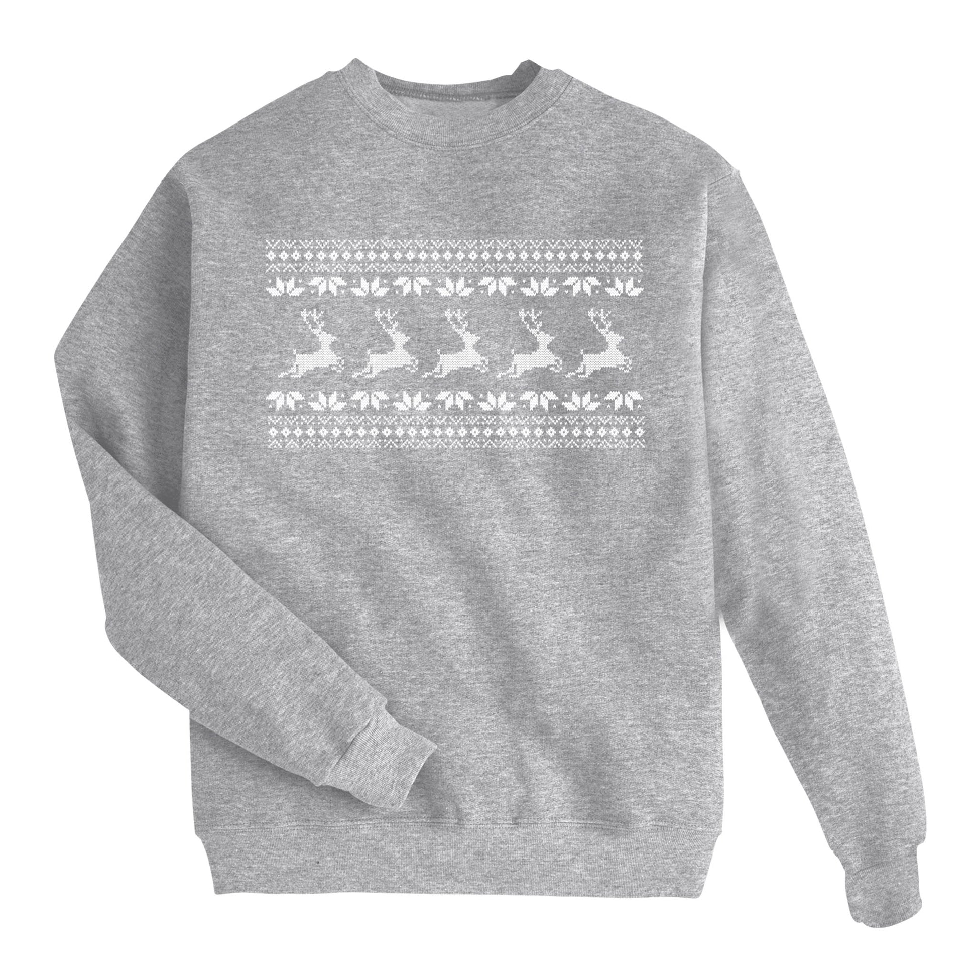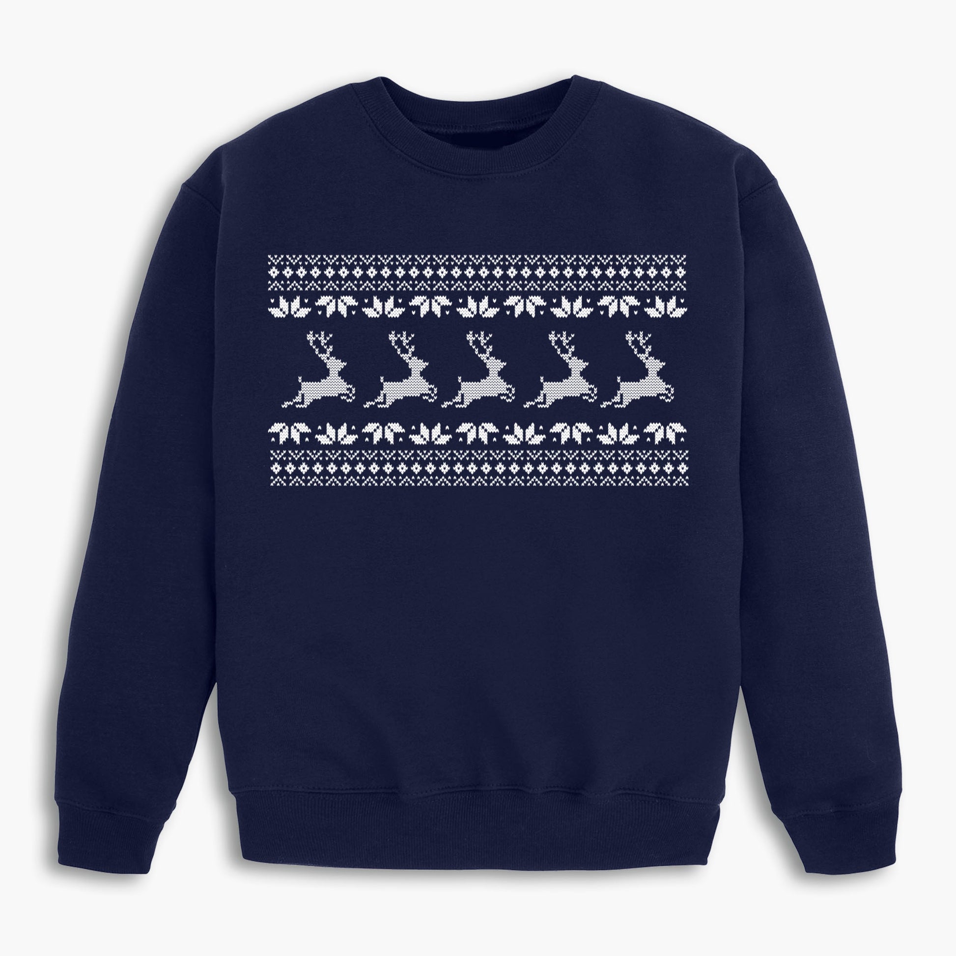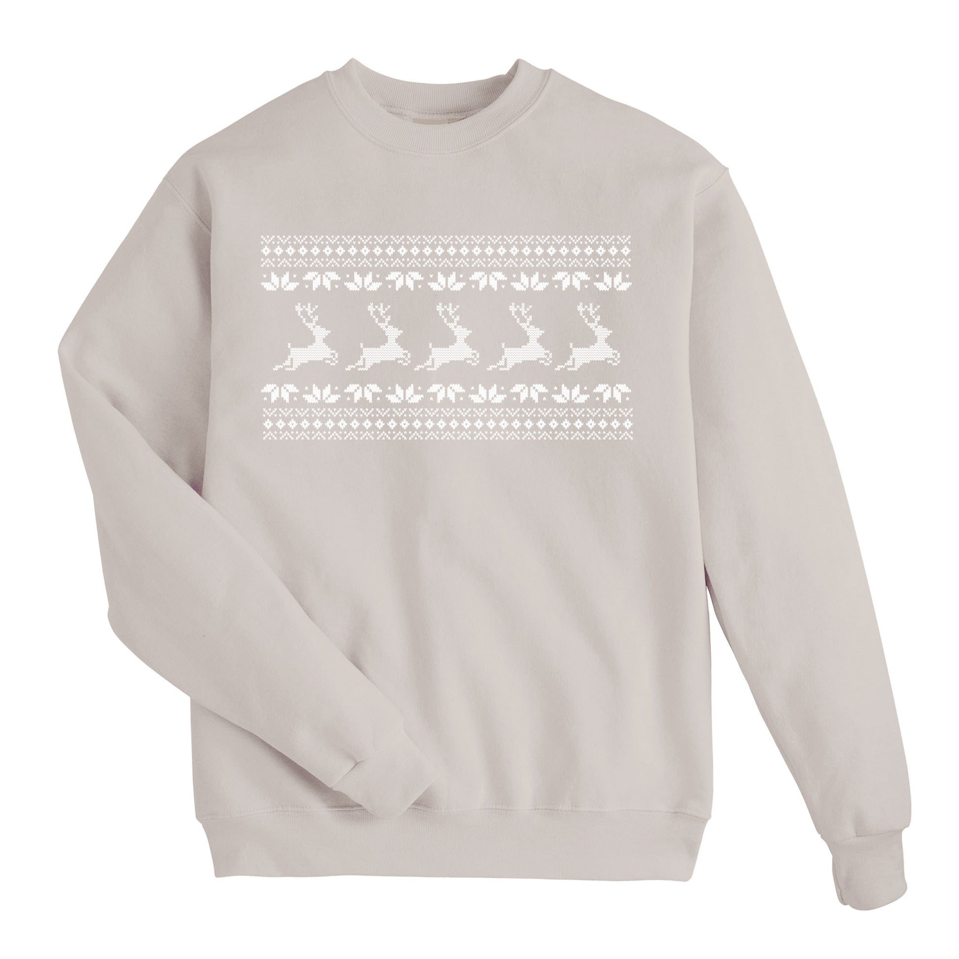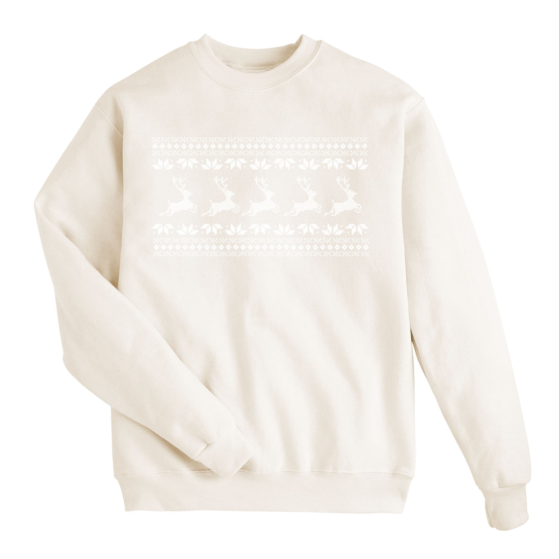 Fair Isle Holiday graphic with Reindeer in a white color on front of sweatshirt.