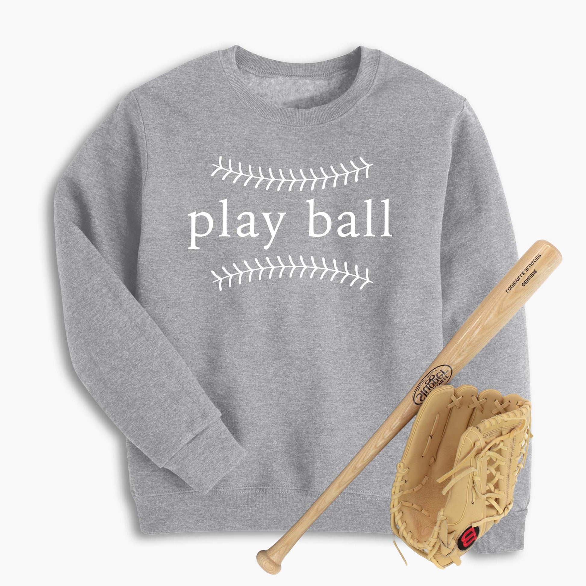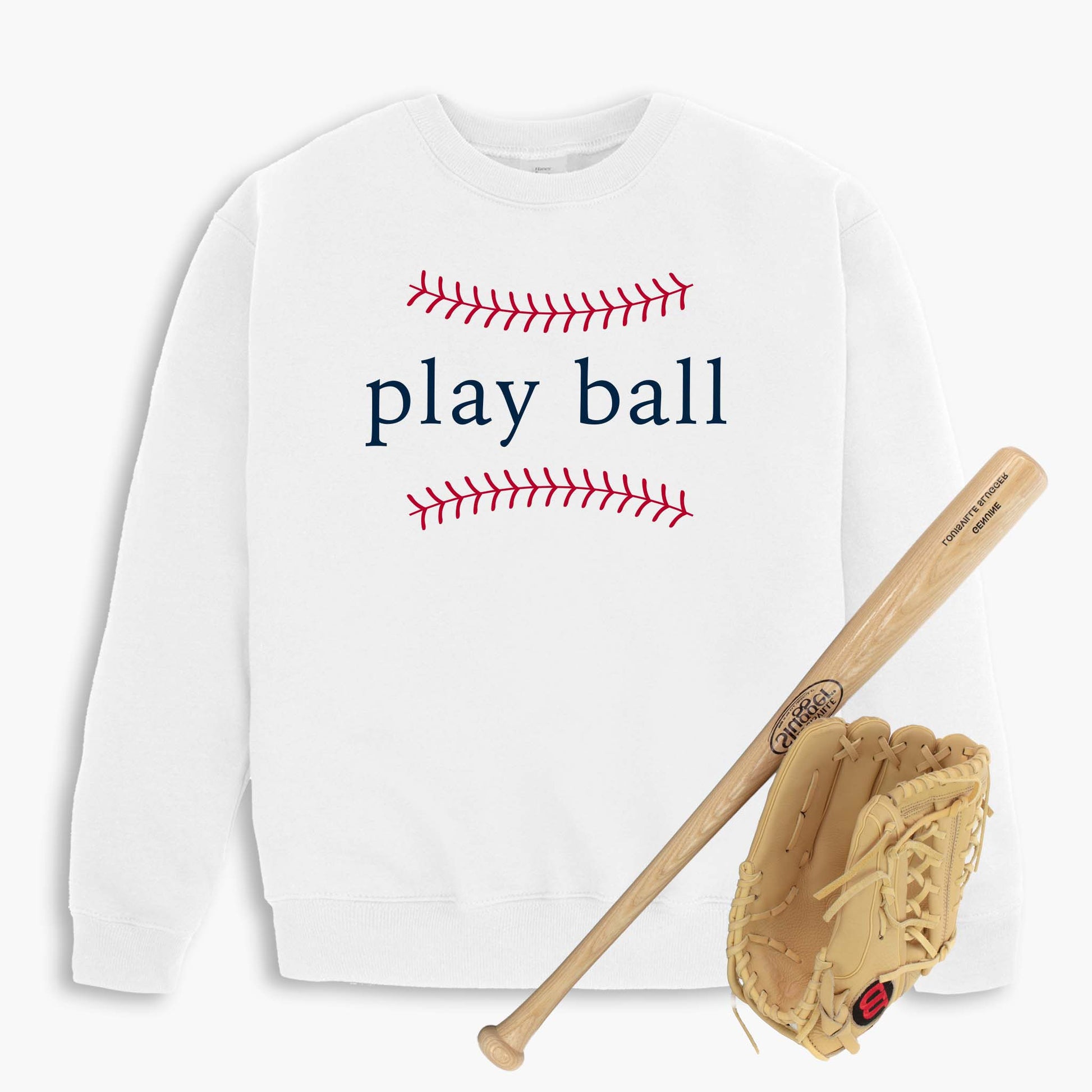 Play Ball in a modern graphic with baseball stitches in either multi red and blue, white or grey.