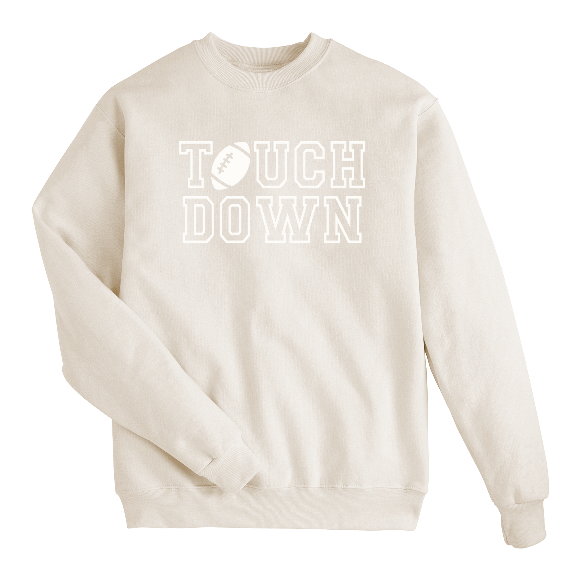 Touch Down on front of sweatshirt. Graphic color varies for sweatshirt.